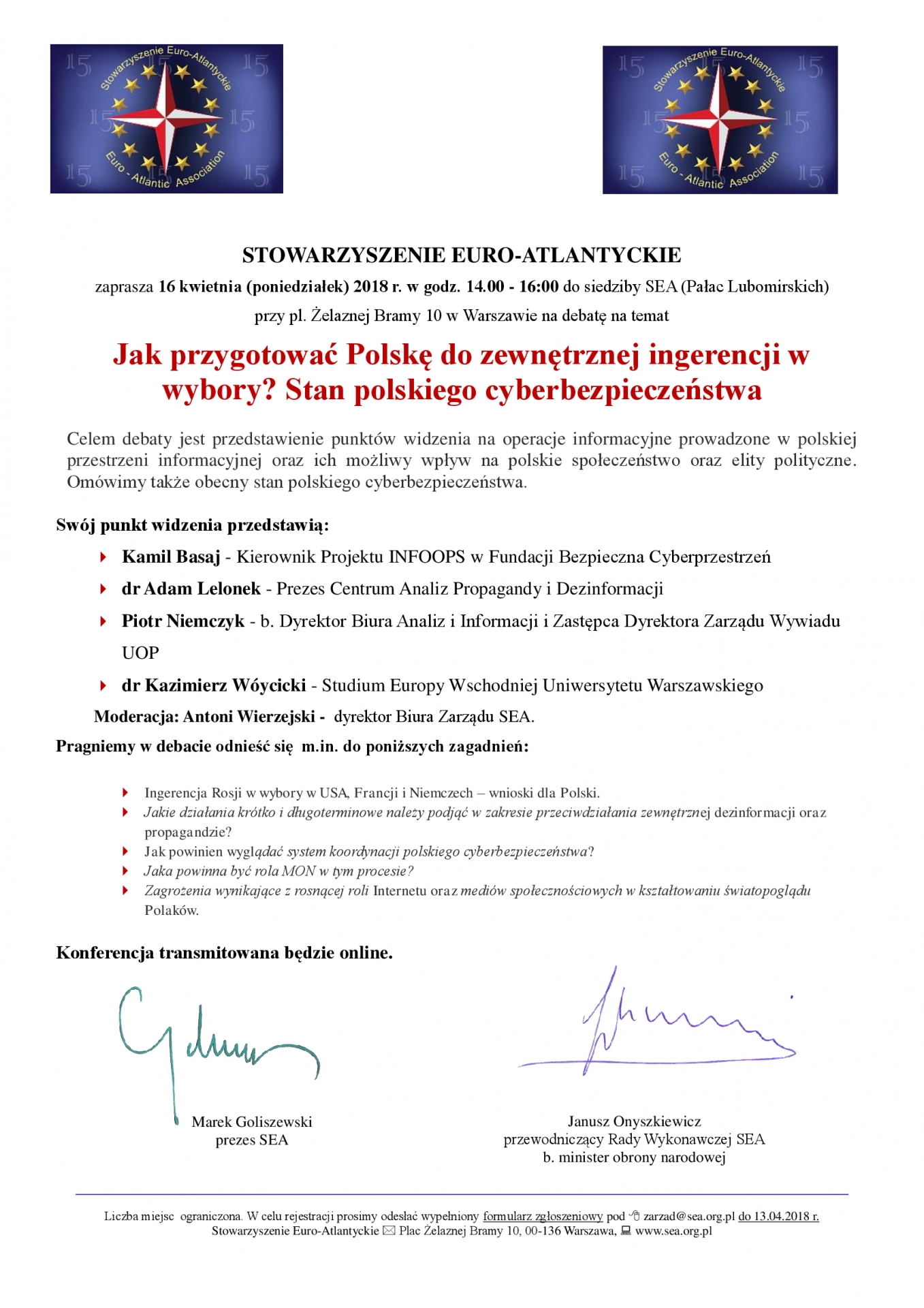 STOWARZYSZENIE EURO-ATLANTYCKIE zaprasza 16 kwietnia (poniedziałek) 2018 roku, o godz. 14.00 do SEA (Pałac Lubomirskich) przy pl. Żelaznej Bramy 10 w Warszawie na debatę pt.