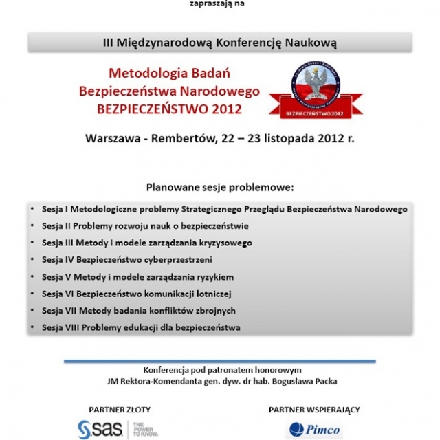 SEA i AON zapraszają do udziału w kolejnej edycji Konferencji Metodologia Badań Bezpieczeństwa Narodowego BEZPIECZEŃSTWO 2012, która odbędzie się w dniach 22-23 listopada 2012 r. w Rembertowie.