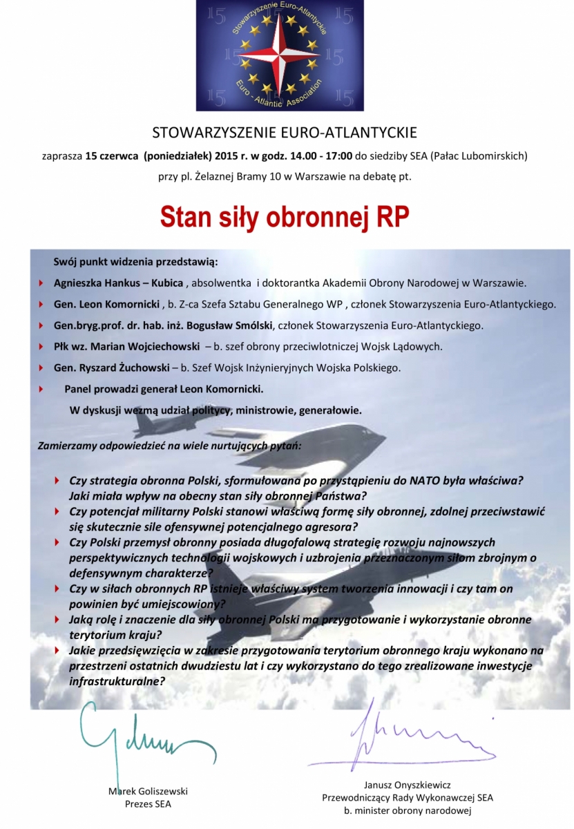 STOWARZYSZENIE EURO-ATLANTYCKIE zaprasza 15 czerwca 2015 r. w godz. 14.00 – 17:00 do siedziby SEA (Pałac Lubomirskich) przy pl. Żelaznej Bramy 10 w Warszawie na debatę pt. "Stan siły obronnej RP"