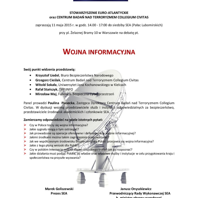 STOWARZYSZENIE EURO-ATLANTYCKIE oraz CENTRUM BADAŃ NAD TERRORYZMEM COLLEGIUM CIVITAS zapraszają 11 maja 2015 r. w godz. 14.00 – 17:00 do siedziby SEA (Pałac Lubomirskich) przy pl. Żelaznej Bramy 10 w Warszawie na debatę pt. "WOJNA INFORMACYJNA"