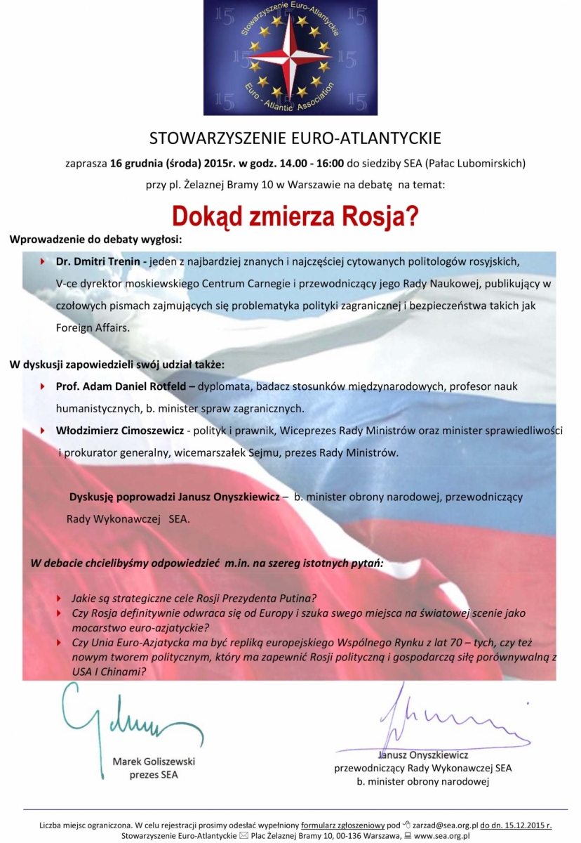 STOWARZYSZENIE EURO-ATLANTYCKIE zaprasza 16 grudnia (środa) 2015r. w godz. 14.00 – 16:00 do siedziby SEA (Pałac Lubomirskich) przy pl. Żelaznej Bramy 10 w Warszawie na debatę pt. Dokąd zmierza Rosja?