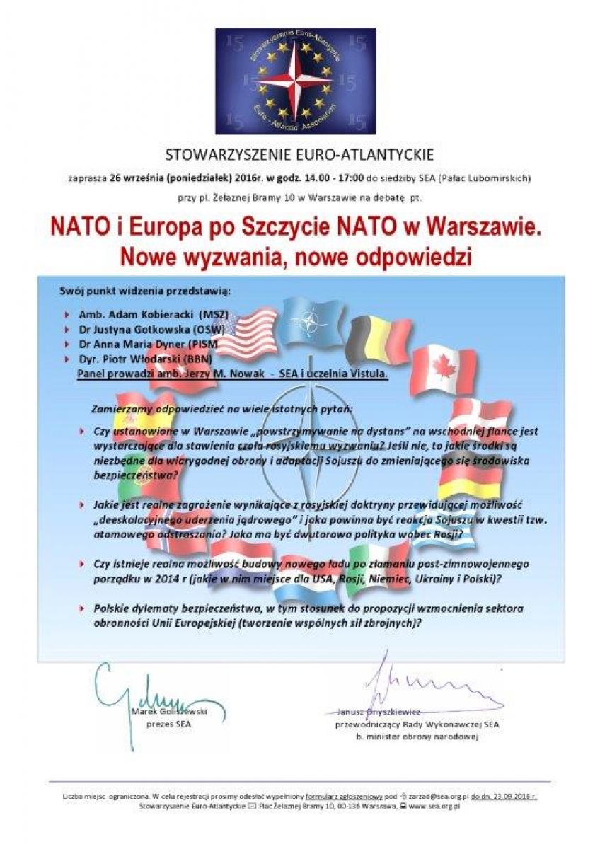 STOWARZYSZENIE EURO-ATLANTYCKIE zaprasza 26 września (poniedziałek) 2016r. w godz. 14.00 – 17:00 do siedziby SEA (Pałac Lubomirskich) przy pl. Żelaznej Bramy 10 w Warszawie na debatę pt. NATO i Europa po Szczycie NATO w Warszawie. Nowe wyzwania, nowe odpowiedzi