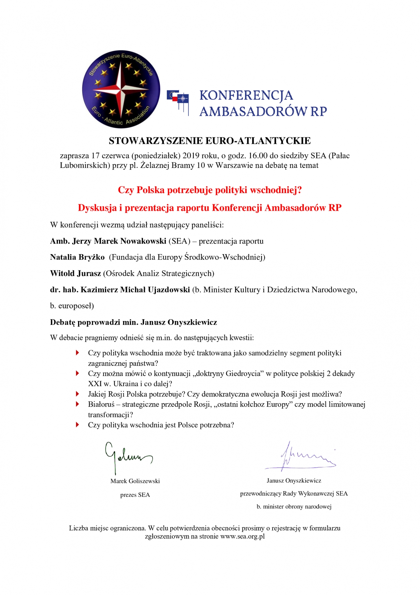 Stowarzyszenie Euro-Atlantyckie zaprasza 17 czerwca (poniedziałek) 2019 roku, w godz. 16.00 – 18.00 do siedziby SEA (Pałac Lubomirskich) przy pl. Żelaznej Bramy 10 w Warszawie na debatę na temat „Czy Polska potrzebuje polityki wschodniej? Dyskusja i prezentacja raportu Konferencji Ambasadorów RP”.